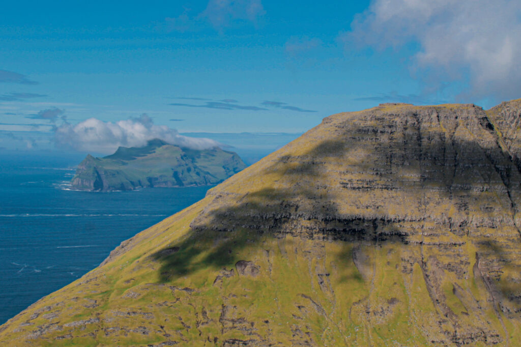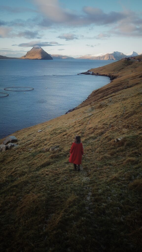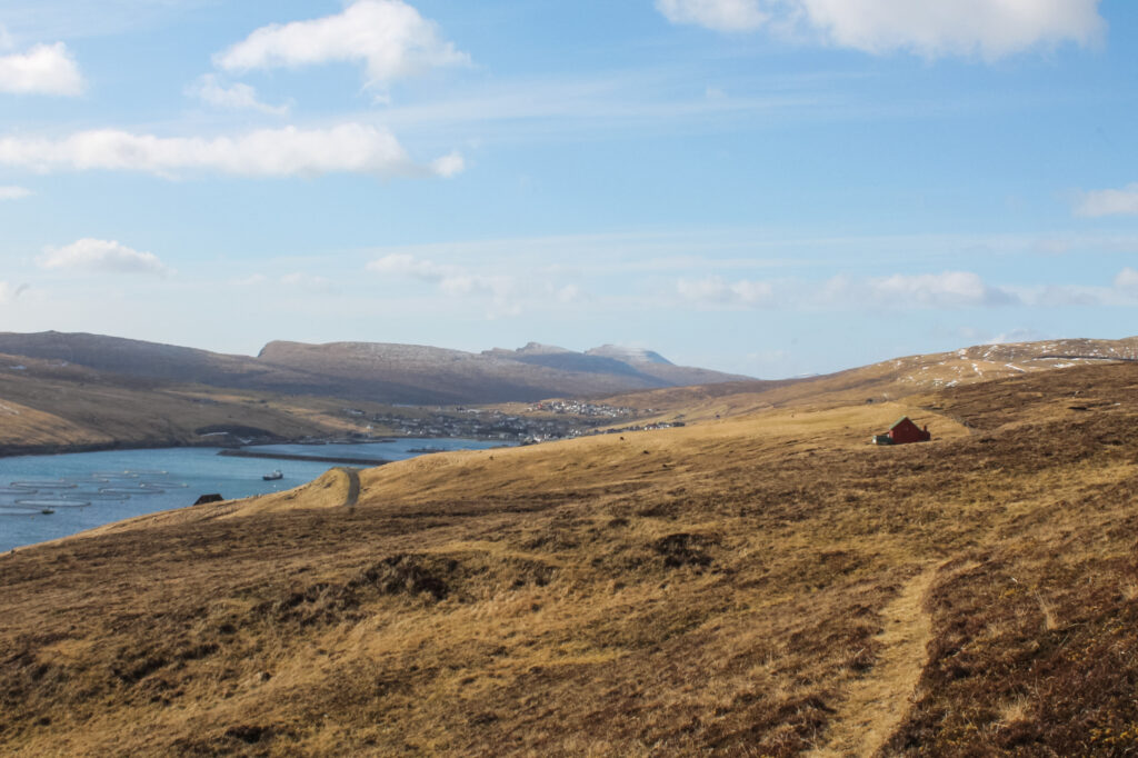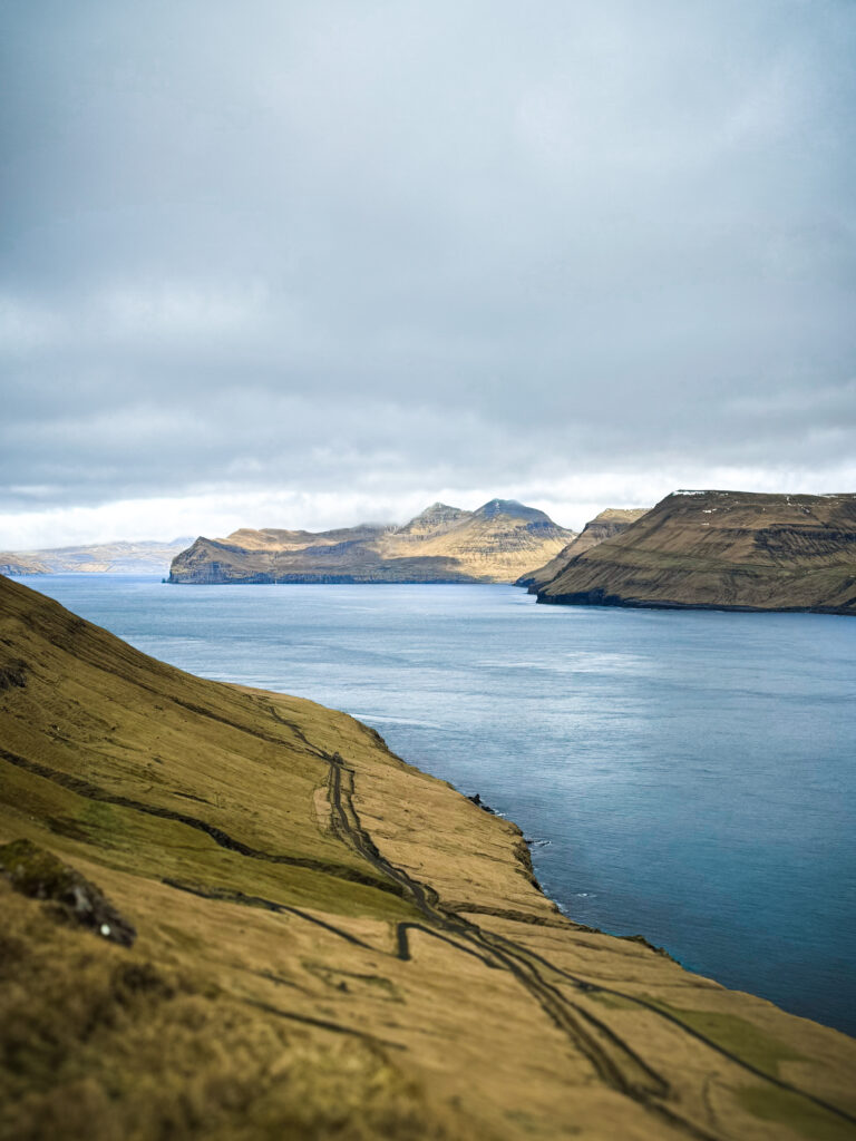 The trail winds picturesquely through hills, but don’t worry—there are no steep climbs or tricky stones, just plenty of stunning views! You’ll see the sea sparkling in the sun, the coastline of the neighboring island of Streymoy, the tiny island of Koltur in all its glory, and Hestur peeking out from behind.